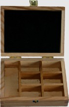 LBH innen: 200 x 200 x 25/15 mm Rahmen aus 8 mm Hartholz, gezinkt, Boden/Deckel 3 mm Birkensperrholz, 2 Patentscharniere, 1 Patentverschluss, mit gefrästem Sperrholzeinsatz - passend für 9 Einsätze div. Größen, Deckel mit 10 mm Schaumstoff