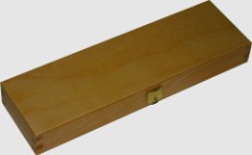 LBH außen: 270 x 136 x 35 mm, Boden/Deckel 3 mm Birkensperrholz, Rahmen und Deckel farblos lackiert, 2 Patentscharniere, 1 Patentverschluss, mit Einteilung (2 Leisten) für 6 Bohrer 235 mm lang, Deckel mit 10 mm Schaumstoff